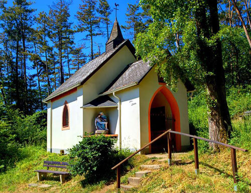 schmiegen, prägen neben dem Turm der spätgotischen Pfarrkirche sowie der Burgruine Coraidelstein das