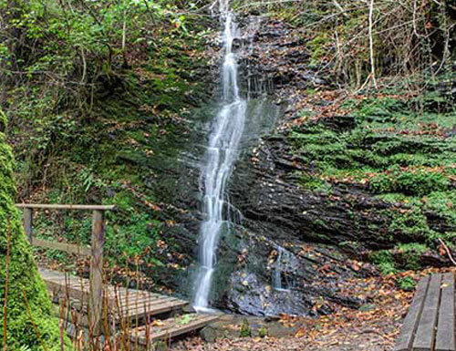 den bewaldeten Höhen und bestimmen den Charakter der Landschaft. Häuser, die sich an die Hänge